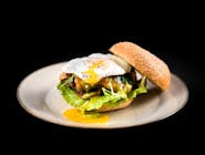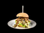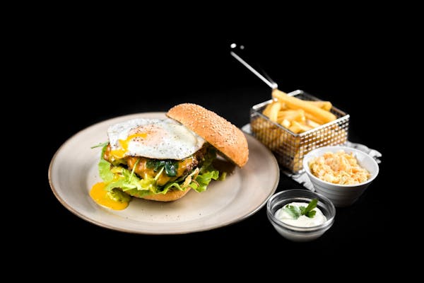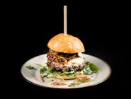 Blue cheese burger (mletý hovězí stařený krk., blue cheese dip, slanina, rajče, salát, cibulová tráva
